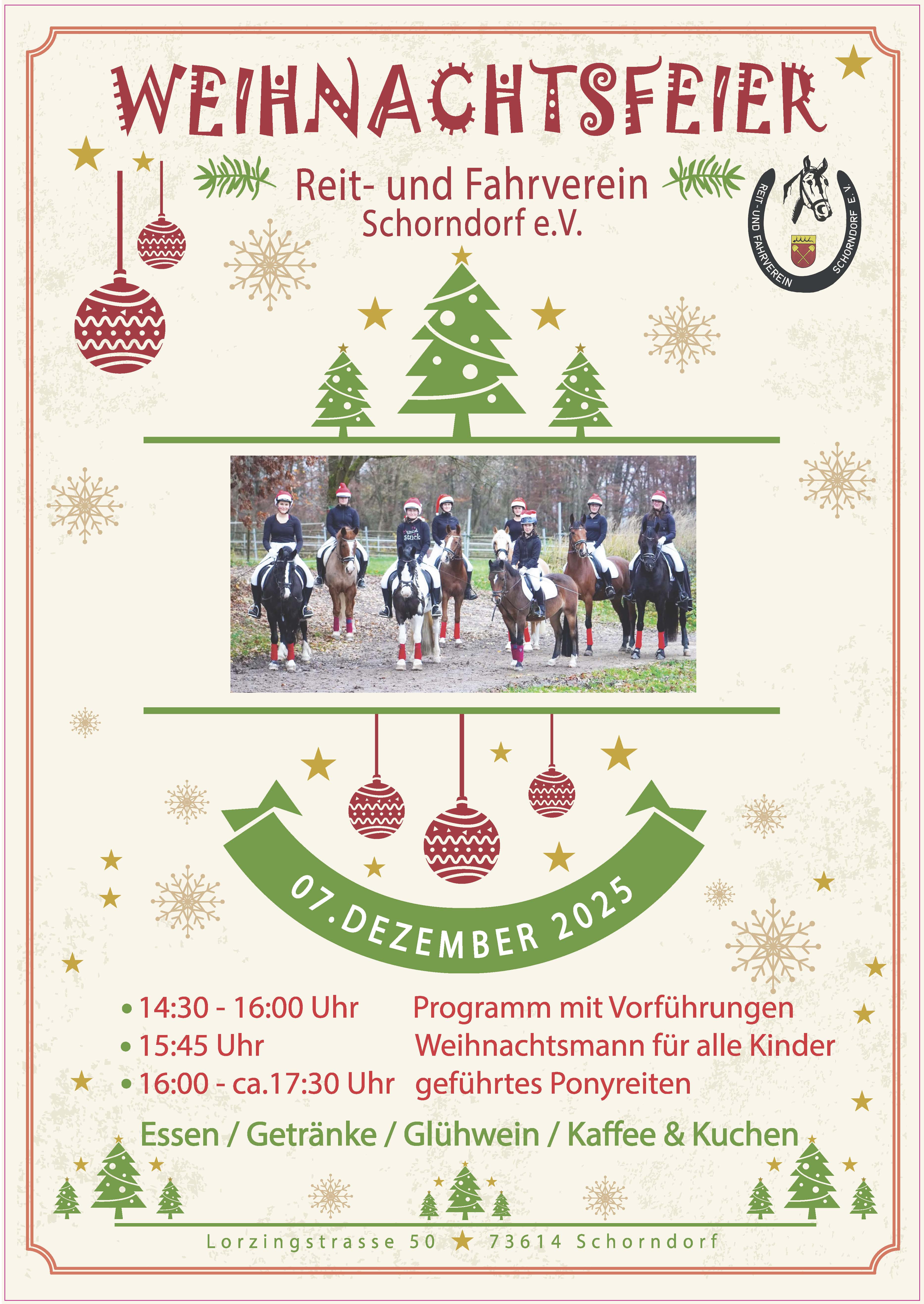Am Sonntag, den 07.12.2025, ab 14:30 Uhr laden wir herzlich zu unserer Weihnachtsfeier ein. Freut Euch auf ein stimmungsvolles Programm, eine Bescherung und für die Kinder ab 3 Jahren geführtes Ponyreiten. Für das leibliche Wohl ist bestens gesorgt. Hier gehts zum Programm der Weihnachtsfeier